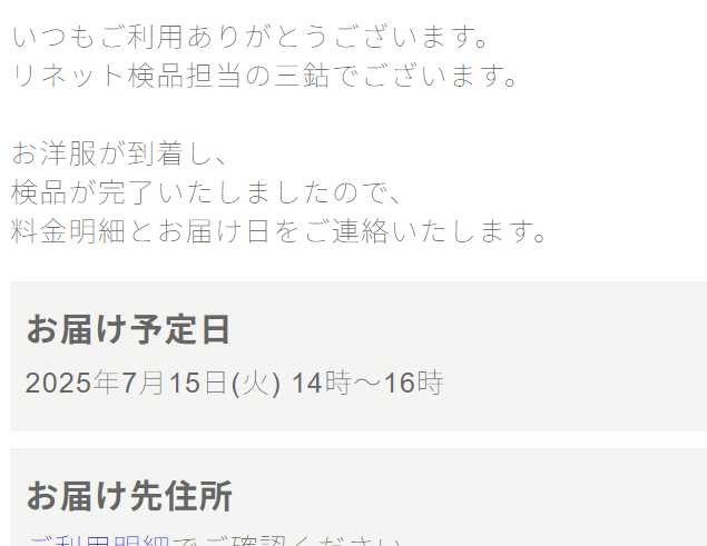 また、クリーニング完了後に「お届け予定日のご案内」というメールが届きますが、